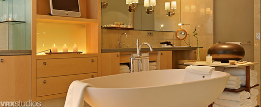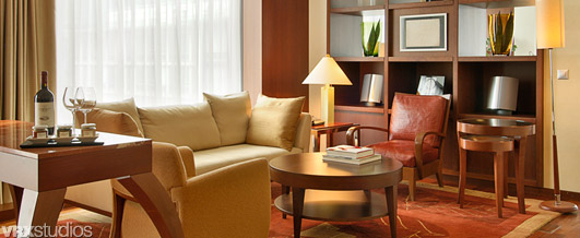 Park Executive Suite King (108 кв.м) — панорамный вид на Цюрих; номер выдержан в насыщенных медных и красных тонах, гармонирующих с полом из дерева вишни; состоит из спальни, гостиной с обеденной зоной, кабинета, мраморной ванной комнаты с ванной и душем