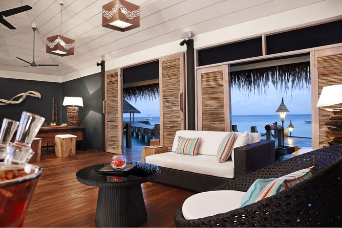 32 Premium Indulgence Water Villas (85 кв. м) - состоит из спальни с кроватью king-size, гардеробной, ванной комнаты, террасы с зоной отдыха и спуском в лагуну. Расположены на сваях на воде. Вид на море.