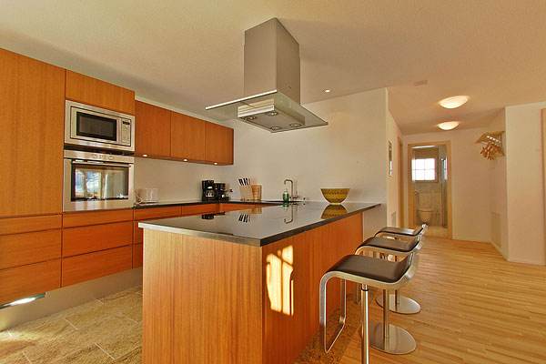 Пятикомнатные апартаменты Haus Crans занимают первый этаж шале. Дизайн современный, в теплых тонах, с элементами модерна, много свободного пространства.