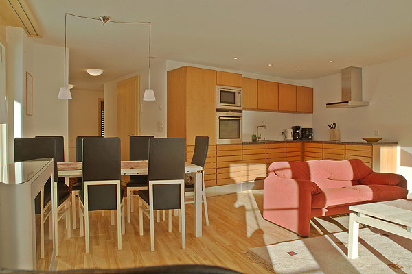 Четырехкомнатные апартаменты Haus Crans занимают первый этаж шале. Дизайн современный, в теплых тонах, с элементами модерна, много свободного пространства.