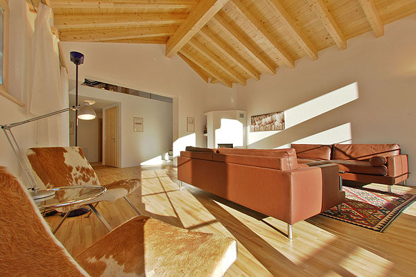 Шестикомнатные апартаменты Haus Cransзанимают второй и чердачный этажи шале. Дизайн современный, в теплых тонах, с элементами модерна, много свободного пространства.