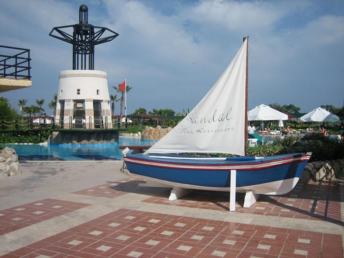 У нас система ультра все включено. С 12.00 и до ночи разные спиртные напитки на выбор вплоть до всяких экзотических коктейлей – все бесплатно. Между обедом и ужином в маленьких кафешках в подвальчике ( Street café) чай кофе, мороженное и разные кондитерские изделия. В общем, при заезде нам дали карточку где все это расписано, вот и ходим по расписанию, исследуем территорию. Наш ребенок не вылезает из бассейнов. Их тут по-моему пять. Один из них прямо под окнами нашего номера. Есть и закрытый бассейн. В море искупнулись «для галочки», но пока все – вода холодная, хотя само море очень чистое и прозрачное и наверное здорово купаться в нем когда оно теплое. Хотя дно галечное, но в специальных тапочках нормально.