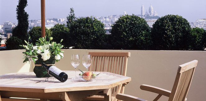 Расположен на верхнем этаже здания; состоит из спальни, гостиной, ванной комнаты, 3 балконов и террасы; с панорамным видом на Париж. Возможно совмещение с еще одной спальней.