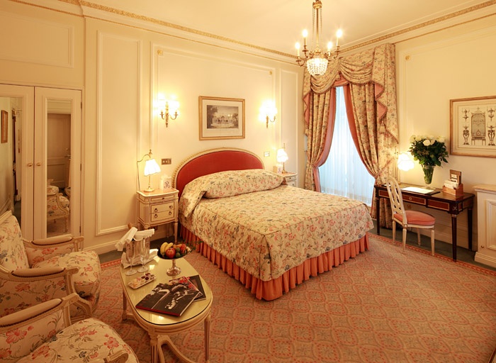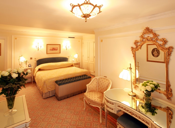 The Royal Suite (157 кв.м.) - двухуровневый номер поражает изысканностью интерьеров. На первом этаже разместилась уютная гостиная с оригинальными рукописными полотнами, здесь за овальным столом могут собраться 6 человек, а рядом в обеденной комнате за столом из красного дерева может расположиться семья из 10 человек. На второй этаж в изумительную овальную спальню ведет незаметная с первого взгляда лестница. Кроме овальной спальни на втором этаже находится небольшой кабинет, гардеробная и мраморная ванная с античными зеркалами и встроенным плазменным телевизором. Интерьер всех комнат построен на контрасте светлых и темных тонов. Пастельные стены, яркие бордовые или темно-синие портьеры, полы из темных пород дерева и т.д. Дизайнерские акценты расставлены на мебели, обивка которой изобилует цветочными орнаментами. Также следует обратить внимание на потолок, который украшен позолоченными листьями и цветами.