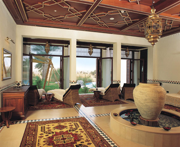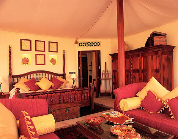 В архитектуре "шатров" использованы мотивы бедуинских жилищ, все материалы натуральные и превосходного качества. Для усиления переживания пустыни одна из стен шатра выполнена из стекла. Выдержанные в «пустынных» тонах охры, апартаменты обставлены резной мебелью ручной работы, отделаны мрамором и золотом, декорированы роскошными тканями. Дизайн интерьеров цитирует традицию арабского жилья, одновременно создавая атмосферу сдержанной роскоши и безупречного комфорта.