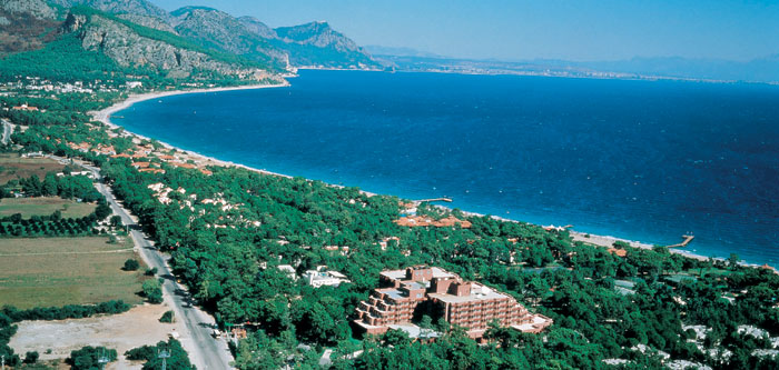 в районе Бельдиби, на самом берегу моря, в 42 км от аэропорта г. Анталия, в 14 км от г. Кемер.