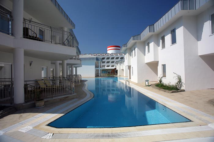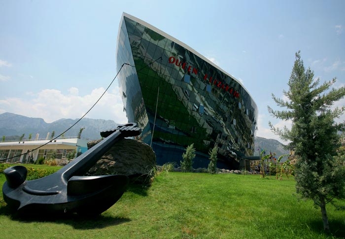| Отдыхали в этом отеле в июле 2007. Видели ранее, как он строился, впечатлились и решили непременно туда подъехать. Смотрится отель, конечно, очень эффектно, не переставала наслаждаться все 8 дней. Под лайнер стилизовано все, вплоть до зеркалов в виде штурвала. В душе поблагодарила авторов за фантазию в оформлении холла, за бассейн у самого корпуса корабля, за зеркальную отделку носа, за лифты-батискафы. Немного напрягали длиннющие коридоры без окон. Отель был новый, поэтому в глаза бросалась недоделанность инженерных коммуникаций. Несколько раз были перебои с электричеством, в номер по коридору ползли наощупь, аварийного освещения отчего-то не предусмотрено. Худо работает вентиляция в нулевом этаже. Там располагаются конференц-залы, магазины, спа и т. д. Сыро и душно. Боулинг дорогой, дорожки короткие. В интернет-кафе я не заметила вентиляции вообще! Больше 20 минут там находиться трудно, на это, видимо, и рассчитывали проектировщики. Каток растаял. Нет отбоя от комаров. Настольный теннис поставлен кое-как, не разыграешься. Еще в этом подвальном этаже стоит несколько игровых машин и 3 бильярдных стола, кафешка имеется. К персоналу никаких претензий. Отдыхают там русские, турки, украинцы и отчего-то много израильтян. Мне неважно, кто отдыхает рядом, лишь бы в ухо не орали, но тут, извините, не могу не высказаться... Бывала я в Израиле, летала оттуда в самолетах, где пол-салона на свои места и не садилось, говорили одновременно все, люди из разных концов перекрикивались друг с другом, по рядам через головы передавали конфеты, пирожки... Такой же базар в отеле. Вот мы отправляемся играть в бильярд. За соседним столом с шумом играет компания израильской молодежи. Девушке не дотянуться до шара, она залезает с ногами на стол, бьет, да так остается на столе отдохнуть. Компания ест гамбургеры, их стаканы стоят прямо на нашем столе, на сукне. Убирать не собираются, уношу стаканы сама. Играем. Является семья - мама, папа, дети. Бесцеремонно встают над душой, вплотную у стола, начинают пристально наблюдать за игрой. Через 10 минут родители уходят, дети нависают лбами над бортиками, я их отгоняю, боюсь задеть. Стоило отойти за стаканом сока, мальчик тут же овладел моим кием, мол, наигралась, родители - ноль эмоций. Лёша чуть не дал ему в лоб, кий отобрал силой. Подобное происходило и в ресторане, и в бассейне. Вот эта с детства культивируемая бесцеремонность лично мне вдруг представила израильтян как людей, с которыми я бы не хотела отдыхать вместе. У отеля маленькая территория, вечером негде сесть посидеть, равно как и пройтись. Тесно и у бассейна. Пляж через 1, а не 2 дороги, не шибко оживленную, потом идти еще метров 100, правда, дорожка была не мощеная. Лежаков полно, тенты просторные, вполне чисто, деревянный пирс тоже с лежаками. Справа от пляжа в море вдается труба, насчет которой у меня самые мрачные подозрения. Где-то раз в 3 дня из этой трубы спускали ледяную воду, но без запаха и прозрачную. Купаться в этой холодной воде было неприятно, уходили в левую часть пляжа. Ресторан крытый и открытый достаточной вместимости. Еда - чересчур много сложносочиненных композиций, маловато видов цельного мяса и рыбы, в целом - хорошо. Воду дают в бутылках. Полистала книгу отзывов - они самые полярные. Как всегда. В общем, отель красив, задумка великолепная, но не во всем доведена до ум