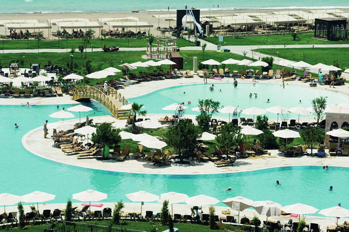 Общая площадь отеля 91 000 кв.м. На этой территории расположились открытый бассейн площадью 5000 кв. м, отдельный бассейн для вил 1800 кв. м, аквапарк «Сaretta» с восьмью горками, отдельный детский бассейн, 4 теннисных корта, поле для мини футбола..