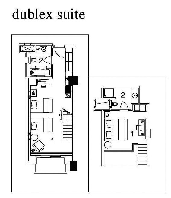 22 Dublex Suite – номера расположены в основном здании. В отеле два типа номеров данной категории. Тип первый – 100 кв. м. 3 номера с видом на море и 3 с видом на горы. Номера состоят из двух спален, зала, двух ванных и балкона. Тип второй - 55 кв. м. Номера состоит из двух спален: одна для родителей и вторая, поменьше, для детей. Специальные услуги отеля: гостям присваивается статус VIP клиента, дополнительное заполнение мини бара, фрукты, цветы, белое и красное вино в номер, резервация в а ля карт ресторанах.