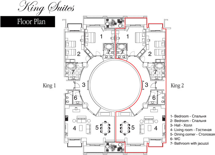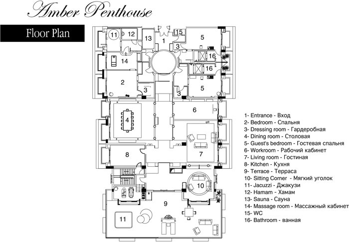 1 Penthouse Suite (500 кв. м ) - номер состоит из трех спален, столовой, зала, 3 ванных, сауны, большой террасы с бассейном, небольшого бара и бильярдного стола, комнаты для массажей, джакузи, комнаты для просмотра ТВ с домашним кинотеатром. Номер соединен с шестью стандартными номерами. Специальные услуги отеля: гостям присваивается статус VIP клиента, VIP трансфер аэропорт – отель - аэропорт, индивидуальная регистрация, дополнительное заполнение мини бара, фрукты и канапе в номер, банный набор принадлежностей, приготовление комнаты перед сном, по желанию сервируются блюда из а ля карт ресторана, специальное место на пляже, включены все местные напитки, а также R.Martini, Mar.Drut Champagne, Bombay Gin, Chivas Regal, Bailiy’s , Martini, услуги прачечной, чистка обуви, доставка газет.