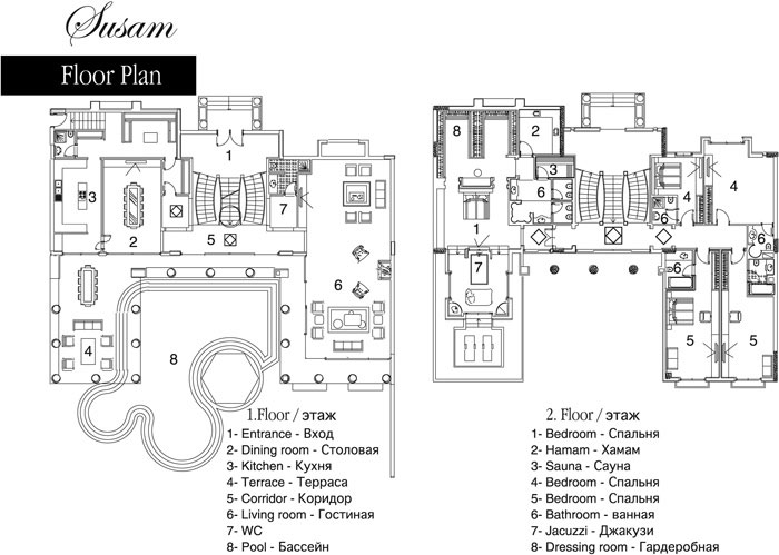 5 Villa Safran (200 кв. м) – состоит из двух спален с двумя ванными (одна из них с джакузи), комната, разделенная на столовую и кухню. У виллы есть отдельный бассейн. Над бассейном располагается небольшая комната для отдыха со стеклянным полом. Специальные услуги отеля: гостям присваивается статус VIP клиента, VIP трансфер аэропорт – отель - аэропорт, индивидуальная регистрация, дополнительное заполнение мини бара, фрукты и канапе в номер, банный набор принадлежностей, приготовление комнаты перед сном, по желанию сервируются блюда из а ля карт ресторана, специальное место на пляже, включены все местные напитки, а также R.Martini, Mar.Drut Champagne, Bombay Gin, Chivas Regal, Bailiy’s , Martini, услуги прачечной, чистка обуви, доставка газет.