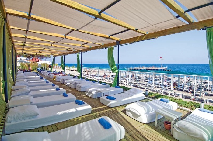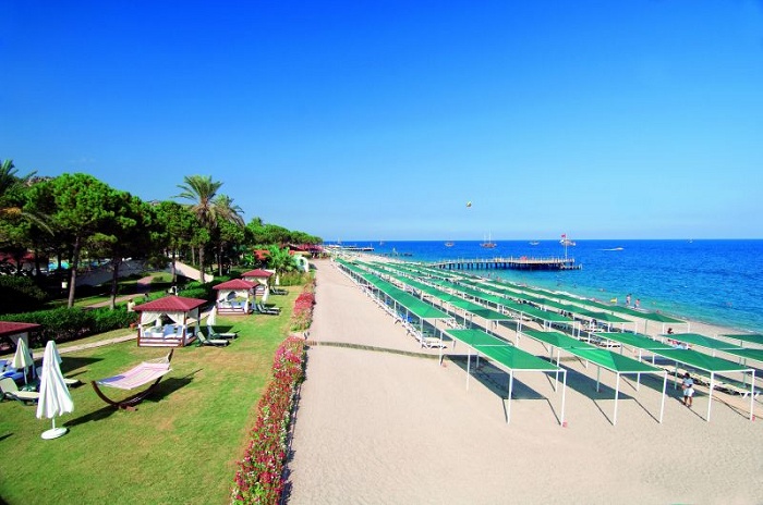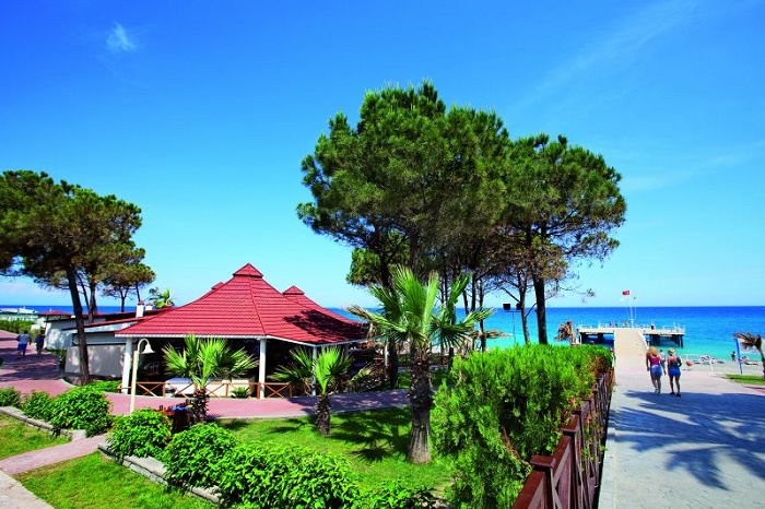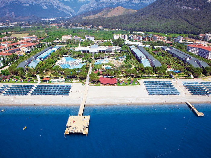 на берегу моря в курортном городке Кириш, в 6 км от г. Кемер, в 65 км от аэропорта Анталии.