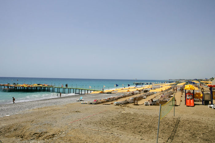 в 90 км от аэропорта г. Анталии, в 30 км от г. Аланьи, в 1 км от поселка Окуржалар, на самом берегу моря.