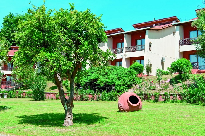 | Отдыхала в начале июня 2010 года. Расселили стремительно, без проблем и дополнительных оплат выдав ключ от номера с видом на море. Территория большая. Основное 5-этажное здание (в нём ресторан, спа-центр и маленький бассейн) находится на вершине, чуть ниже бассейн с горками, амфитеатр и ещё один бассейн и – вниз, к морю. Бунгало разбросаны по всей территории. Полно зелени. Номер в бунгало традиционный - кровать, кресло, тумбочки, стол с зеркалом, телевизор, мини-бар (в тумбочке под телевизором), шкаф (в нём сейф), балкон или так называемая терраса, санузел. Ежедневно мини-бар пополняется бесплатно бутылкой воды. В шкафу имеются вешалки - штук десять, тёплые пледы и сейф (ключ от него можно взять под залог на ресепшене). Сейф небольшой, но фотоаппарат средних размеров, паспорта, деньги, мобильные телефоны - всё это там умещается. Пол в номере - кафель, так что обязательно возьмите с собой тапочки (или тёплые носки), если собираетесь жить в бунгало. Кондиционер индивидуальный, холодит зверски. Санузел совмещённый. Имеется флакон с шампунем, твёрдое мыльце, фен, шапочка для душа. Балкончик небольшой, но на нём умещаются два стула. У меня же была так называемая терраса – отделанный кафелем участочек, где стояли два стула и столик. Захватите из дома верёвку и прищепки, дабы соорудить сушилку, т.к. такой простой предмет интерьера там не предусмотрен. Да, влажность большая, бельё сохнет плохо, так что берите как минимум два купальника. Персонал приветливый. Говорят на немецком и турецком, но многие знают русский в пределах необходимых для общения фраз. Кстати, если Вы выучите пару слов на турецком (хотя бы "спасибо" и "здравствуйте"), то станете любимым гостем. Различий в отношении персонала к людям разных национальностей я не заметила. В номере убирались каждый день. График уборки плавающий, у меня был с 14 до 16 часов. Как часто меняли полотенца и бельё, сказать точно не могу, поскольку не помечала их грязными ногами, пятнами от фруктов и т.п. Чаще всего отличить б/у от нового не представлялось возможным, да и цели такой не было... В ресторанах и барах официанты убирают со столов по мере опустошения посуды. Напитки можно заказать, сидя за столом, но мне лично было проще самой налить – так быстрее. Питание на троечку. Во-первых, лично для меня очень странный график питания: завтрак с 7 до 10.30 и практически следом - обед с 12 и 12.30 до 14 часов. Дальше терпите до вечера, ужин в 19.00. То есть если Вы не успели проголодаться после завтрака в течение двух-трёх часов, то до ужина сможете перекусить только печеньками с чаем и мороженым (с 16 до 17). Хотя везде написано, что снэк-бар и ресторан на пляже кормят до 15.30, реально после двух часов из еды только гёзлеме и остатки картошки-фри. Во-вторых, следует добавить ещё и отсутствие разнообразия в еде. Каждый день одно и то же. При всём кажущемся разнообразии, когда всё повторяется изо дня в день, выбор оказывается небольшим. Если вдруг появилось что-то сверх «программы», сразу выстраивается огромная очередь – люди устают от однообразия. Никаких тематических ужинов в основном ресторане нет (ни рыбных дней, ни турецких вечеров, ни т.п.) Свежевыжатый сок по утрам предлагают за деньги, хотя апельсинов вокруг полно. Кроме них из фруктов были только яблоки, арбузы и иногда дыни. Для любителей турецкого чая (в смысле, заварного, а не пакетированног