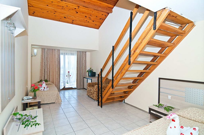14 Family Rooms (26 кв. м) - в спальне ортопедическая кровать (1 односпальная кровать или одна двухспальная), телевизор с диагональю 37 мм. С видом на сад или море. Максимальное размещение - 3+1, 4 человека.