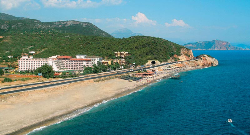 в 125 км от аэропорта г. Анталии, в 7 км от г. Аланьи, в 4,5 км от поселка Конаклы, в 50 м через дорогу от собственного пляжа по подземному переходу.