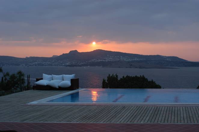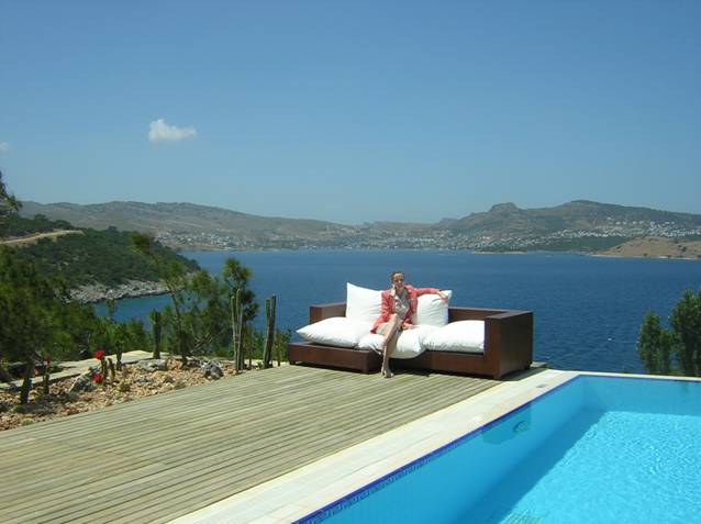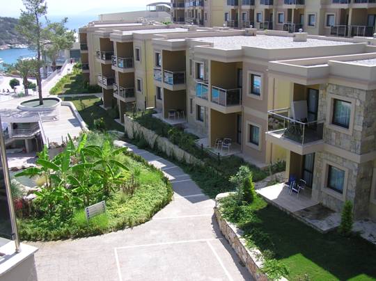 в 45 км от аэропорта и в 22 км от центра г. Бодрума, в 4 км от поселка Гёльтюркбюкю, на самом берегу моря.