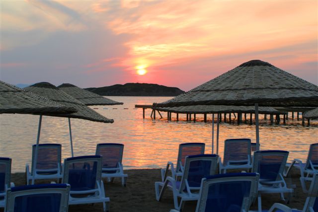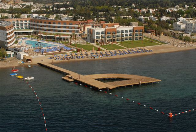 в 52 км от аэропорта и в 22 км от центра г. Бодрума, в 4 км от местечка Тургутреис, на самом берегу моря.
