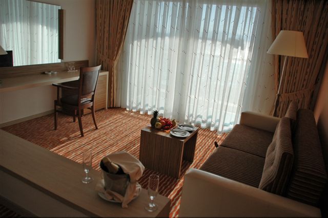 7 Suites - 80 кв.м. Номер состоит из спальни и зала. Ковровое покрытие, ванная комната с джакузи и туалетом, плазменный телевизор, беспроводной интернет, кондиционер, телефон ,спутниковоеTV, мини- бар, сейф, фен, балкон. Вид на море и бассейн.