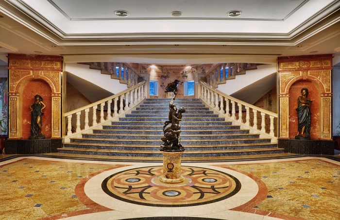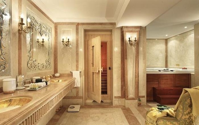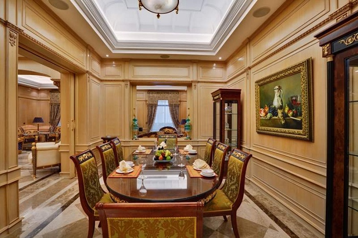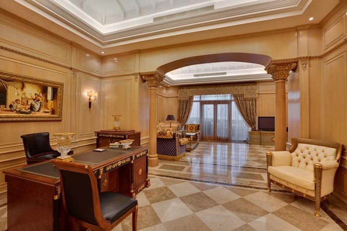 Royale Suite (350 кв.м.) – в номере прихожая, гостиная с обеденной зоной, рабочий уголок. В первом Suite – 2 спальни, во втором только одна, 2 ванные комнаты, халаты и тапочки, гостевой туалет, сауна, джакузи, большой балкон с видом на море, DVD-плеер, кухня с плитой и холодильником, микроволновая печь, набор для приготовления чая и кофе. Максимальное размещение – 4 или 6 чел.