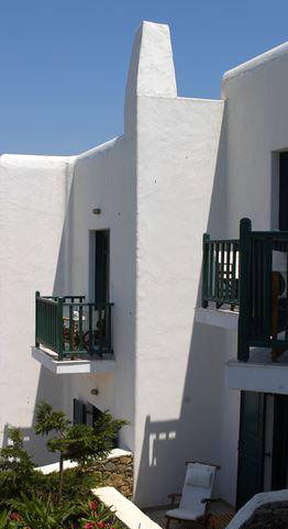 Расположение отеля Tharroe of Mykonos:в местечке Врисси, в 3 км от аэропорта, в 800 м от центра г. Миконос, в 1500 м от моря на склоне небольшого холма. Отель построен в 1997 году, реконструирован в 2003 году.