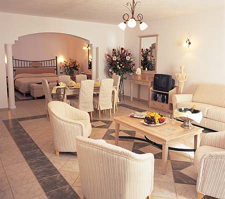 Во всех номерах — элегантные интерьеры в теплых тонах, с удобной мебелью, изысканными украшениями в греческом стиле, уютными балконами и террасами с живописным видом на море и пляж Elia.