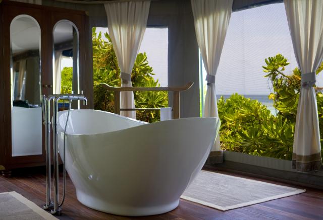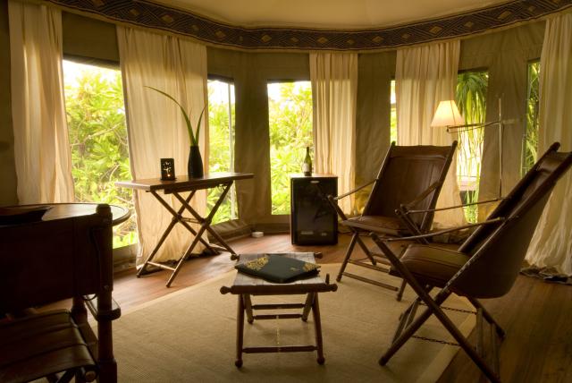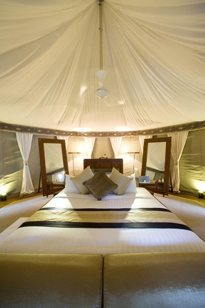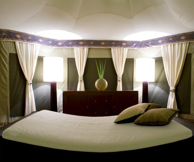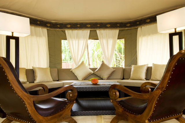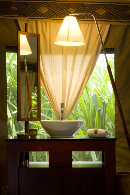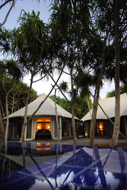 Каждая вилла состоит из трех отдельных шатров, стоящих на деревянном настиле. Один из них предназначен для гостиной, второй - для спальни, третий - для ванной. Просторный шатёр, в которой расположена ванная, имеет также две кушетки для массажа и Spa-процедур. В каждой вилле есть все современные удобства, мебель ручной работы из ротанга и тикового дерева, два душа под открытым небом, большой бассейн, солярий, зона отдыха и столовая зона под открытым небом. Полы в виллах изготовлены из твердых пород древесины.