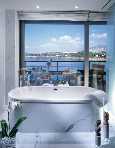 • Excelsior Deluxe Room (41 кв.м) — состоит из спальни, гостиной с рабочей зоной, ванной комнаты, выходит на залив Сароникос