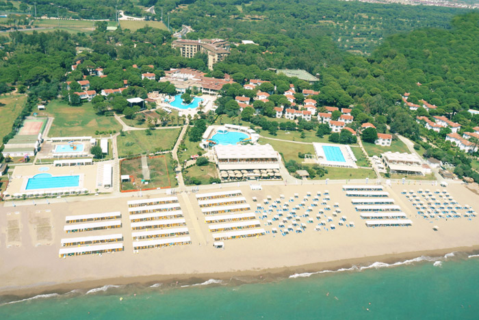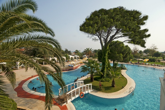 | Отдыхала в этом отеле в июне 2006г. Очень понравилось!! НО отель больше подходит для семейного отдыха, в принципе он так и идет, молодежи мало, хотя если вы общительный,то компанию найти не составит труда.Теперь по порядку: 1. НОМЕРА: советую селиться в главный корпус. Номера просторные и чистые.Есть в наличии ТВ с руским каналом, мини-бар с безалкогольными напитками,в ванной фен.Бунгало же отичаются маленьким номером, неуюно, мебель хуже и вместо ванны душ.Уборка номера осуществлялась ежедневно, полотенца менялись часто.Никогда не оставляю доллары уборщицам, без этого хорошо наводят порядок. 2.ТЕРРИТОРИЯ: Богатый зеленью островок отеля, особенно потрясающий вид с верхних этажей главного корпуса! Для уединения,тишины и релакса можно укрыться в сосновом лесу,расположенном на территории бунгало. там вы можете спокойно уйти от суеты, покачиваясь в гамаке и на качелях, и вдыхая воздух родных русских сосен. 3.ПЛЯЖ: Я очень привиредлива к пляжу,поскольку не люблю гальку и тем более камни-булыжники как на наших просторах матушки-России,поэтому песок - это одна из главных составляющих при выборе отеля. Чистый теплый песочек ласкает ноги,а если вам горячо ходить по песчинкам, то между рядами шизлонгов идут деревянные дорожки.Чистый пляж - претензий нет. 4.АНИМАЦИЯ: Отличная!! Побывала на всех предложенных программах:это изучение турецкого языка,танцы,аэробика,аквааэробика (без нее никуда:) ),дарц,конкурсы у бассейна и много другое.Рябата все говорят по-русски.Вечерние программы тоже не остались без внимания, интересные красивые шоу.Особенно порадовало шоу день жустиниано.Ужин в этот праздник размещался на огромной территории футбольного поля,во время поглащения пищи разыгрывался спектакль,король и королева,проезжающие на колеснице,рабы с рыцарями (очень забавно играли),и в завершении ужина всех приветствовал король мороженого - к столу вынесли оочень большое мороженое для лакомства отдыхающих.Далее действие переходило в амфитеатр,где нашим взорам продемонстрировали красивый спекталь о жустиниано.По заврешении все переместились к главному бассейну где лицезрели великолепное огненное шоу на воде.И окончанием красивого вечера был бокал шампанского и феерический салют!!! 5.ДИСКОТЕКА: Сразу скажу, что в клубы за пределы отеля не выезжала. В самом же отеле диско работает до 2 ночи.Музыка европеская, конечно не обойдется без парочки турецких хитов)),напитки разумеется бесплано. 6.ЕДА: конечно это самая насущная проблема людей, кои видимо толи зажрались дома,толи,наоборот, экономят на продуктах,поэтому изобилие еды в отеле их не устравиает. Господи, даже тошно читать отзывы по отелям,т.к. сплошь и рядом негативы в большей степени направлены на номера и пищу. Всегда можно найти свободный столик - не ходите вы в самый час-пик,а именно в первые минуты открвтия ресторана!! Неужели боитесь вам не достанется мяса или десерта??? Никогда проблем у меня с этим не возникало.очереди по сути создают голодные немцы,что накладывают в тарелку как гарнир и картофель,и рис, и макароны. Каждое утро пила бесплатно апельсиновый фреш (очередь максимум чел 15,что проходит за 5 минут).Для детишек на завтрак просто радость: хлопьев аж видов 8, ешь не хочу как говорится.Если не хотите толкаться в ресторане,то закажите столик в других ресторах:турецкий.фуа-гра,итальянский,кит