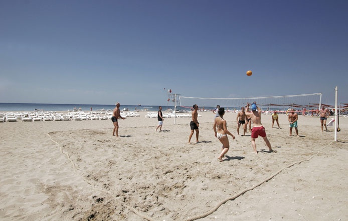 Пляж: два собственных песчаных (один - на первой береговой линии, протяженность – 500 м, второй - через мост со стороны мини-клуба, только для взрослых, имеется бар, протяженность– 60 м). Зонты, шезлонги, матрасы, полотенца – бесплатно.