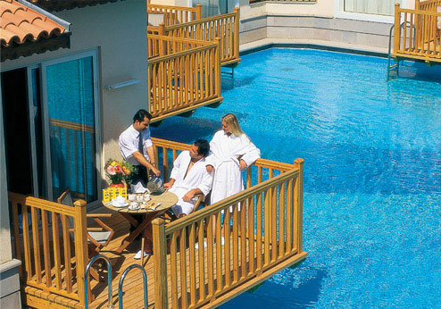 | Расположение. Отель расположен в Белеке (15 миут ходьбы до центра) и в получасе езды до Анталии. Все время находились на территории отеля, поэтому сказать что-либо точнее на тему расстояний до ближайших населенных пунктов затрудняюсь. Возможностей для отдыха, развлечений и покупок хватало и в отеле, так что про развлечения поблизости тоже умолчу. Хотя они там были в большом количестве: разный водный транспорт, парашюты, гольф, футбол, большой теннис и многое другое. Территория. Территория отличная! Много зелени и тентов! Хотя так как мы отдыхали в мае, а особой жары в этом месяце не было, большой роли для нас наличие тени на территории не сыграло. Но ее было предостаточно! Территория очень ухоженная и чистая, все газоны зелененькие, на территории есть абрикосовые деревья, много цветущих кустовых растений. Несколько раз видели больших ползающих по территории черепах, даже иногда их подкармливали. На территории 2 больших основных бассейна, бассейн с горками ( 4 горки, вполне приличные, катаются не только дети), 2 детских бассейна, 1 крытый бассейн и бассейн у вилл на воде, 2 джакузи ( одно в крытом бассейне, другое - в открытом). Магазины в отеле есть. Ассортимент обилен. Интернет кафе также присутствует Стоимость - около 5 евро час. Номер. Еще в турагентсве у нас был заказан обычный стандарт с видом на сад, так как все остальное было занято. Стандарт в обычном двухэтажном бунгало понравился не очень. Взяли улучшенный номер с видом на море. Вид на море может быть только из нескольких номеров одного корпуса - 19. Все остальное расположено в глубине территории. Номер был очень большой и уютный. Двухкомнатных номеров, к сожалению, в отеле нет. В ванной комнате был и душ, и ванна. Выглядело все прилично и чисто (кто-то писал, что зайти противно - неправда, все было замечательно!!!). Из мебели была одна французская кровать, односпальная кровать, кресло, софа, 3 тумбы, журнальный столик. Единственный минус - во всех номерах половое покрытие - кафель, ковролина нет вообще. Убирали номер не очень, причем вне зависимости от чаевых. В принципе было чисто, но без излишеств: цветами ничего не украшали, полотенца лебедем не скручивали. Меняли все и убирались ежедневно, но почему-то не с утра, как мы привыкли во всех отелях, а после обеда, когда многие отдыхают в номере. Минибар заполняли 1 раз в 2 дня. Сервис. Персонал замечательный. очень внимательный, старается удовлетворить любую просьбу. Большинство персонала - турки и турчанки. Английским владеют все, русским тоже, но не на слишком высоком уровне. Однако все очень приветливы и улыбчивы, легко идут на контакт. Спорт. В отеле есть хороший тренажерный зал. Тренажеров много, все в прекрасном состоянии, периодически среди них ходит тренер, с которым можно проконсультироваться. Спорта в отеле много. Два раза в день - пляжный волейбол, в который играют многие. Есть и футбол, мини-гольф, бочча, дартс, настольный теннис, большой теннис и множество других развлечений. Питание. Питание отличное, ультра все включено. Официанты довольно внимательны. Естественно шведский стол, еще есть 5 аля-картов. Еда в общей столовой разнообразная и очень вкусная! Из ресторанов были в итальянском, французском и рыбном. Рыбный понравился больше всего. На территории отеля 3 бара, где есть не только спиртное (кстати, оно совсем не разбавленное, как во мног