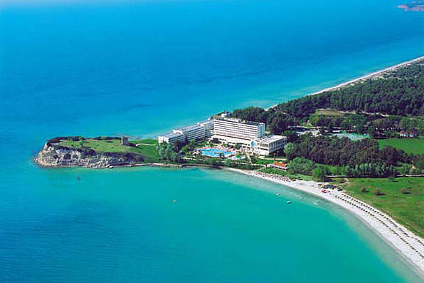 в северной части Греции, на побережье полуострова Кассандра, в 80 км (45 минутах езды) от международного аэропорта города Салоники.