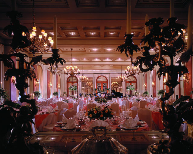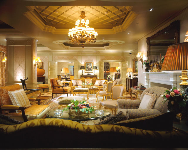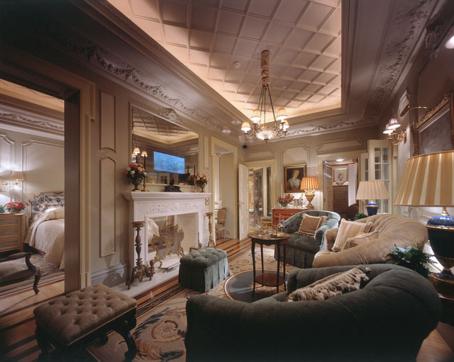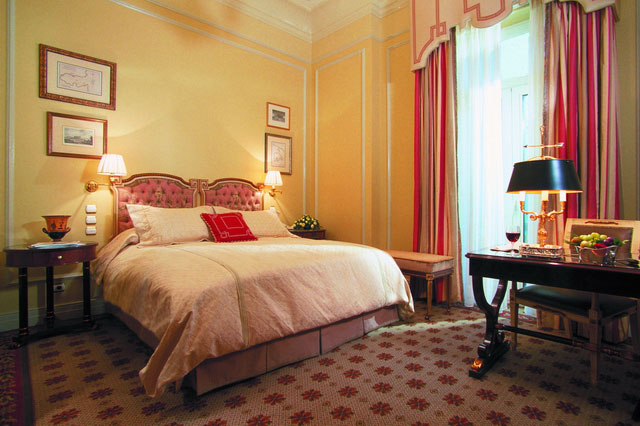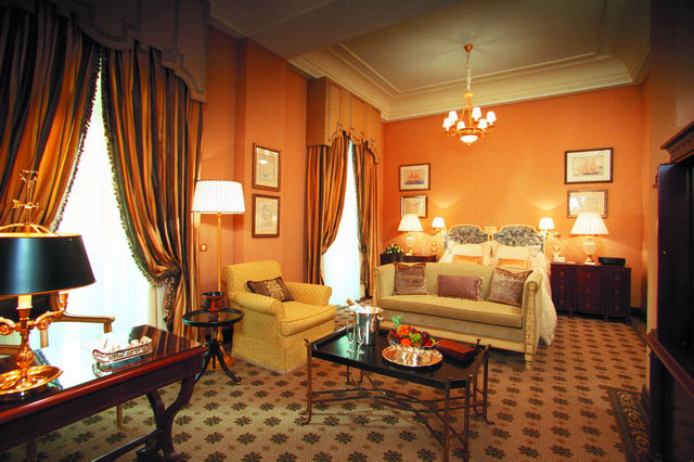 Во всех номерах — индивидуальные классические интерьеры, воссоздающие атмосферу XIX века: высокие потолки с лепниной, дорогие ковры, отделка из благородного дерева и мрамора, хрустальные люстры и зеркала в золоченых рамах, антикварная мебель и старинные предметы искусства, подлинная живопись и изысканные украшения.