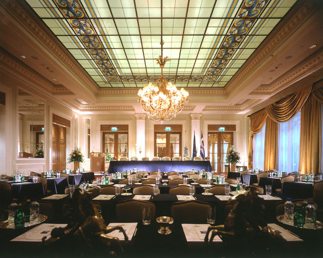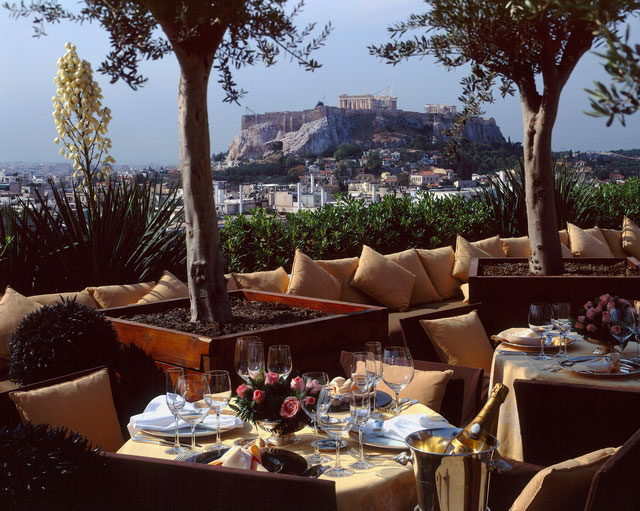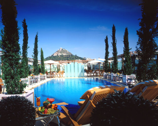 Дворцовая роскошь отеля поражает и восхищает. Хрустальные люстры, великолепные картины, изделия из мрамора и бронзы. Особенно впечатляет сад, расположенный прямо на крыше отеля. Летом здесь работает ресторан, из которого открывается великолепная панорама Афин.