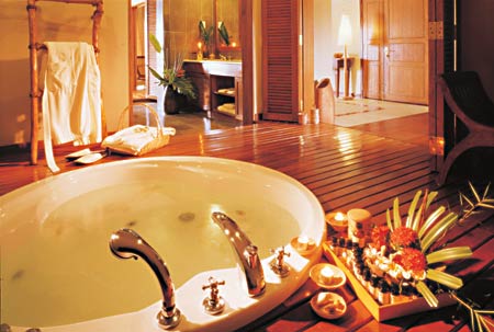 • Anjung (Plaza) (100 кв.м.) — с видом на море, бассейн и сад, 2 гостиных зоны и полностью изолированная спальня, ванна с джакузи.