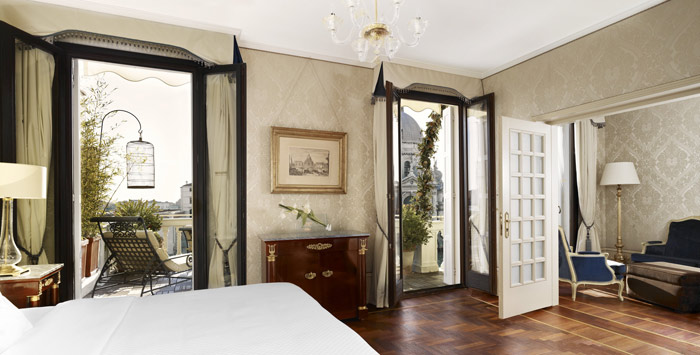 Deluxe Terrace Suite (48-66 кв.м) - терраса, гостиная, спальня, ванная комната. Расположены на 4 этаже в корпусе Regina. Панорамный вид на Большой канал и город. Возможно объединение с номерами категории Classic double room, Unique terrace double room или Stunning Grand Canal view double room.