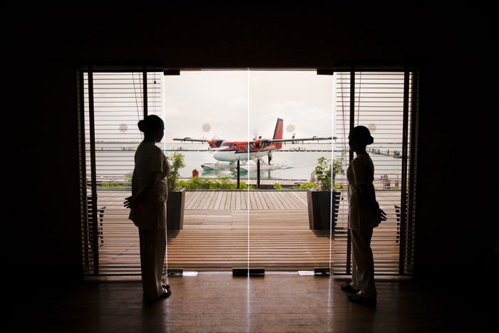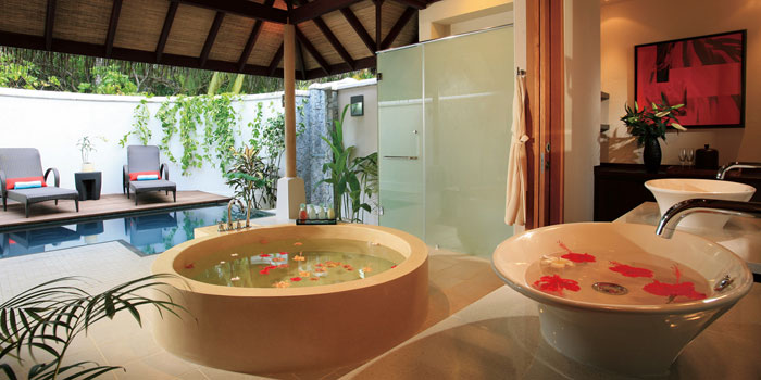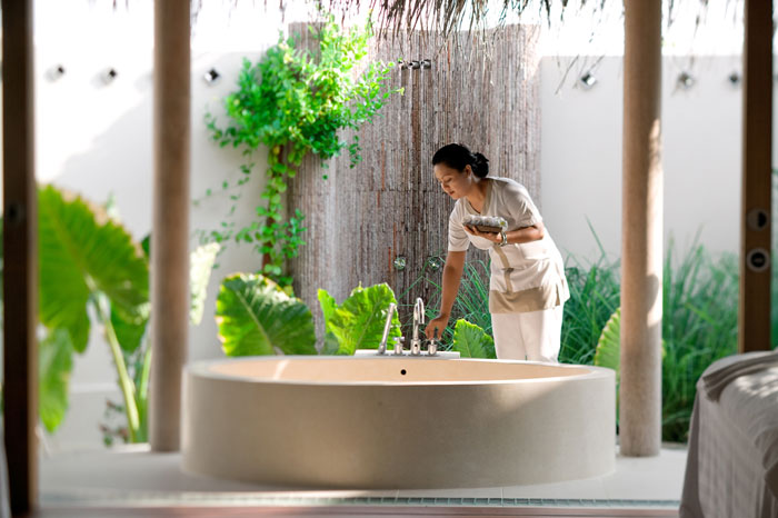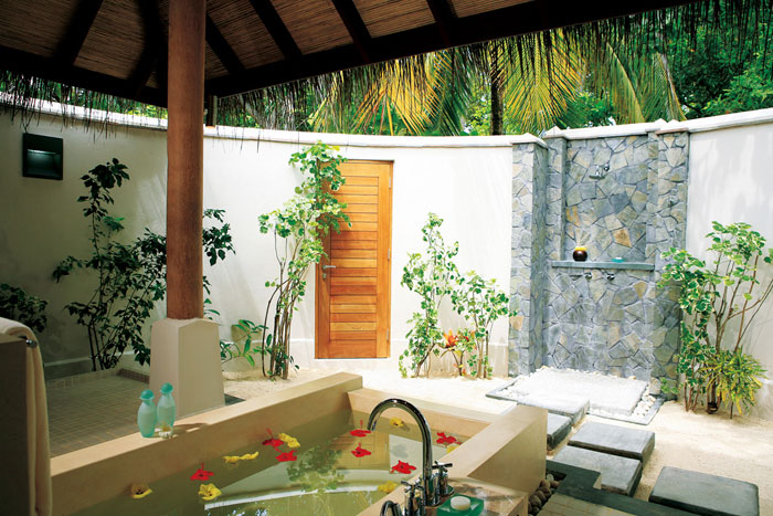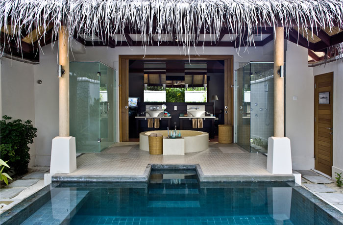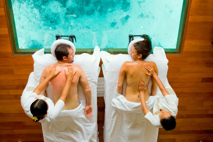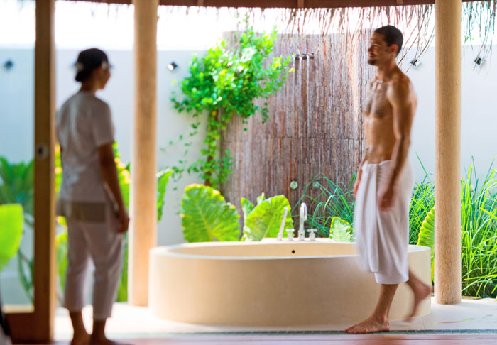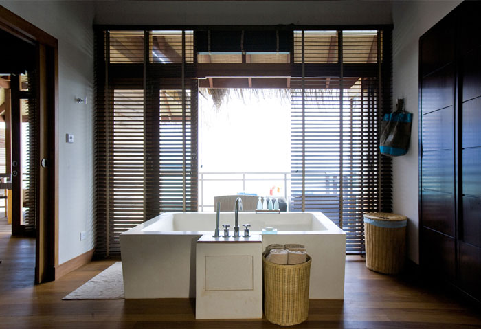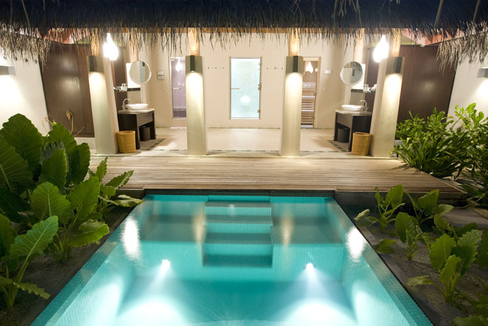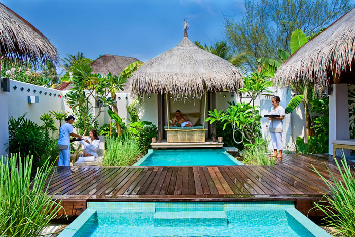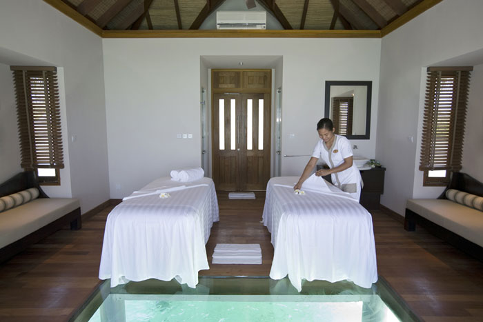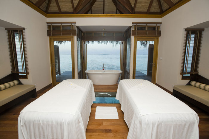 3 Double Water Treatment Villas (32 кв.м) - роскошно обставленные просторные водные павильоны для Spa-процедур на сваях над лагуной, оборудованные открытой террасой с лежаками и душем под открытым небом, паровым душем, отдельным туалетом. В полу комнат для проведения массажа и Spa-процедур имеется прозрачная панель, сквозь которую можно наблюдать за жизнью многочисленных подводных обитателей лагуны.