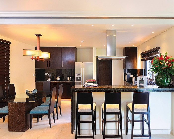 Трехспальная резиденция - персональный дом для большой семьи или компании. Вилла имеет вид на садовый пейзаж или мангровые заросли, расположена на основной территории. Состоит из 3 спален (в двух кровать размера King и в третьей две кровати размера Queen), гостиной с обеденной зоной на 8 человек, кабинета, кухни, 3 ванных комнат с ливневыми душами, душами на открытом воздухе, гостевой туалетной комнаты, просторной террасы с зоной отдыха, садом, собственным бассейном и патио с обеденной зоной на 6 человек. Имеется плазменный телевизор (42 дюйма) с DVD-плейером в каждой спальне. В каждую спальню может быть поставлена одна дополнительная кровать или детская качалка, по запросу. Максимальное размещение — 6 взрослых+1 ребенок или 3 взрослых+4 ребенка.