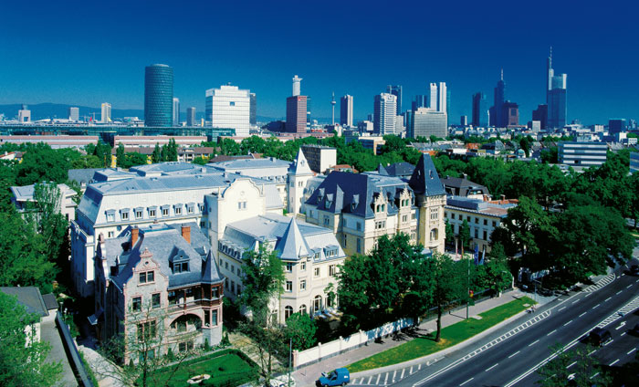 на южном берегу реки Майн, в районе Зашенхаузен (Sachsenhausen), в центральной части города на Kennedyallee, в 15 минутах езды от аэропорта и в нескольких минутах – от ж/д вокзала.