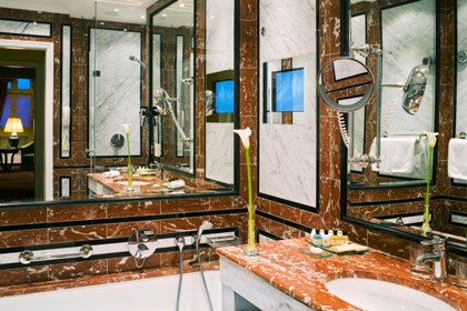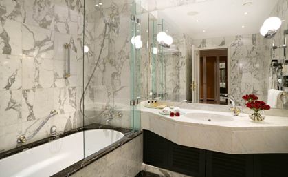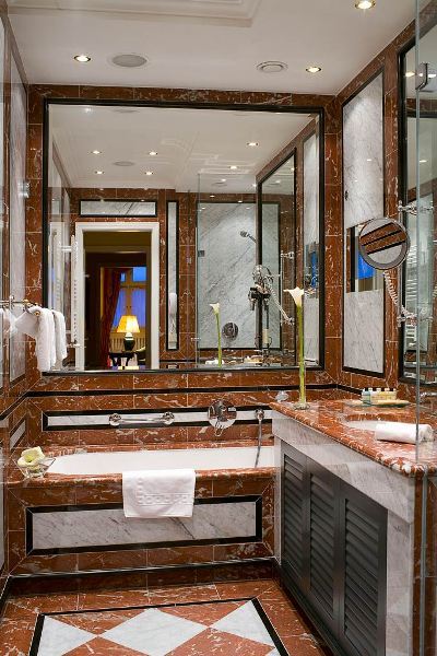 мраморные белые и черные ванные комнаты с большими ванными (оснащены телефонами, фенами, халатами, косметическими зеркалами и косметическими принадлежностями)