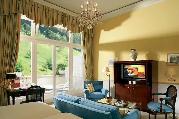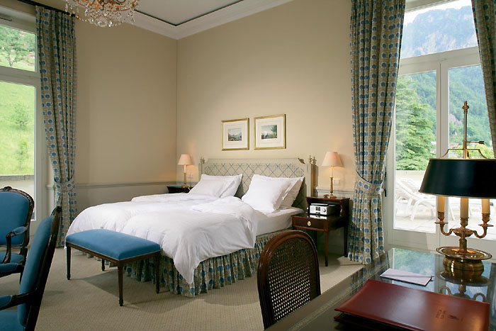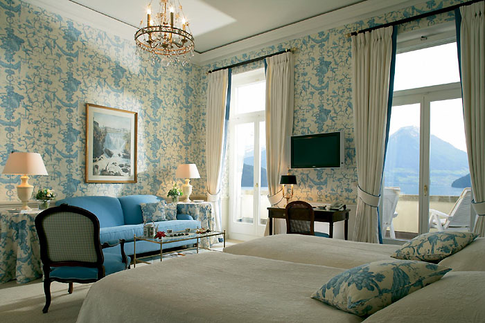 Deluxe Room с видом на гору Rigi - двухместные номера, состоят из спальни с гостиной зоной и ванной комнаты. Расположены в главном здании, две отдельные кровати, сейф, в большинстве из них есть балкон. Просторные и светлые номера, оформлены в изысканных пастельных тонах. Большие ванные комнаты отделаны лучшими сортами белого и розового итальянского и португальского мрамора.