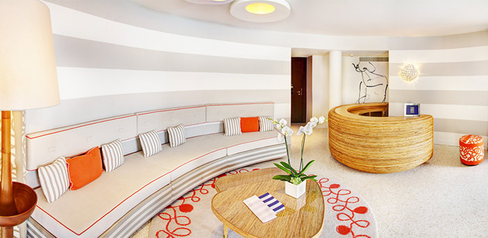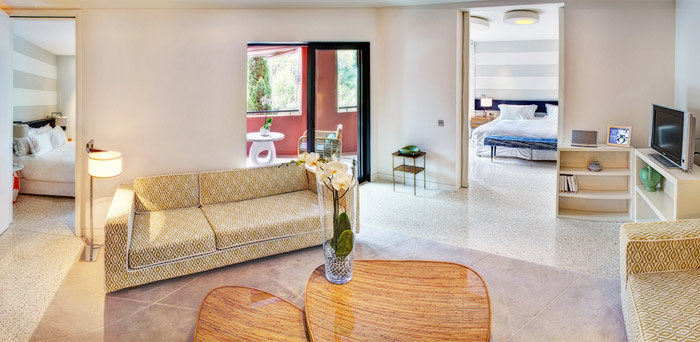 Two Bedroom Suite – Sunshine with jacuzzi (100 кв. м) - прихожая, гостиная с обеденной зоной (стол на 4 персоны), 2 спальни, гардеробная, 2 ванные комнаты (одна – с ванной и душевой кабиной, вторая – с душевой кабиной), терраса с джакузи на открытом воздухе. Дополнительно: DVD-плеер, кофемашина Nespresso. Расположен на 3 этаже. Панорамный вид на море и бассейн.