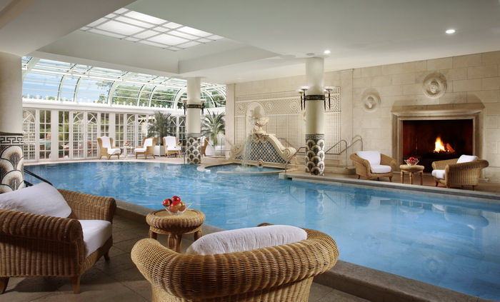 крытый плавательный бассейн со стеклянным куполом, водопадом, джакузи и камином.