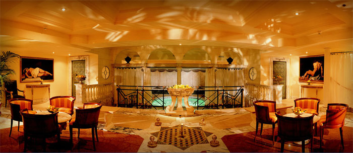 большая паровая баня в римском стиле с отделкой из мраморной мозаики и холодным бассейном.