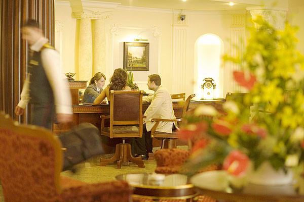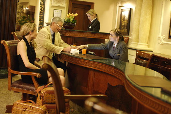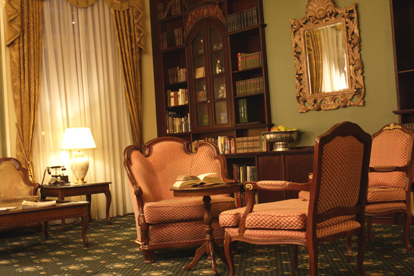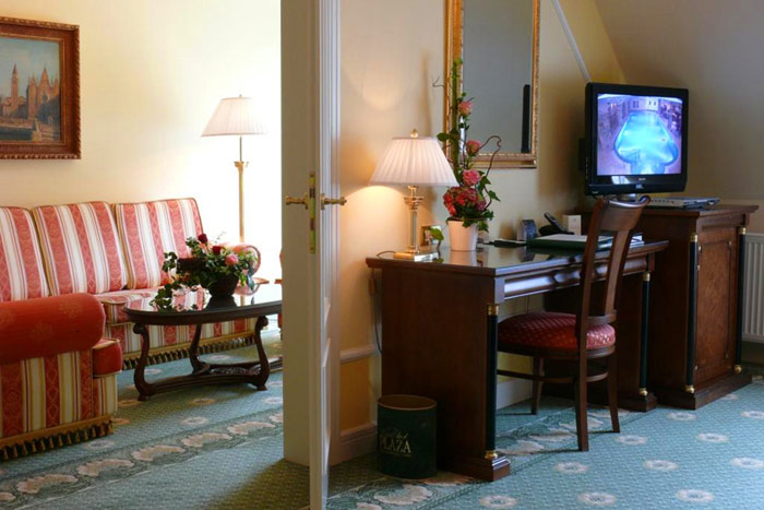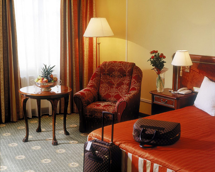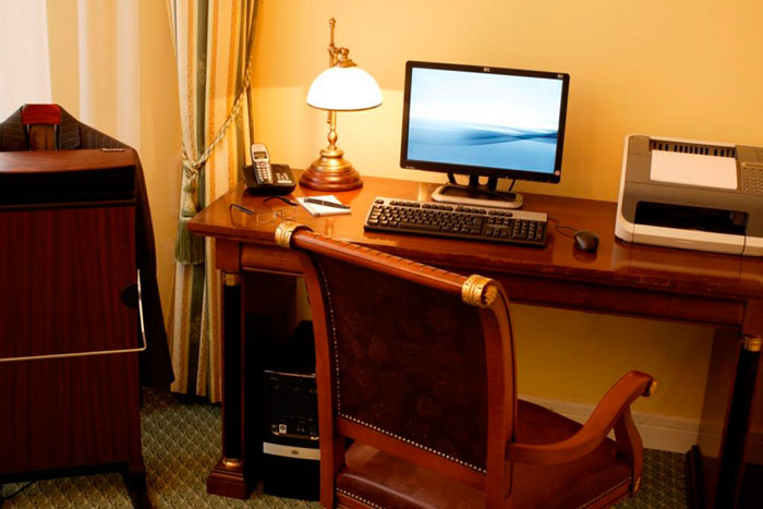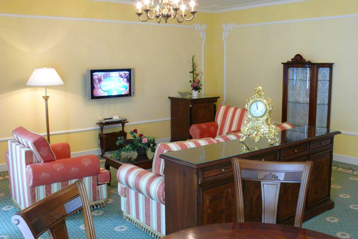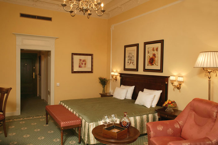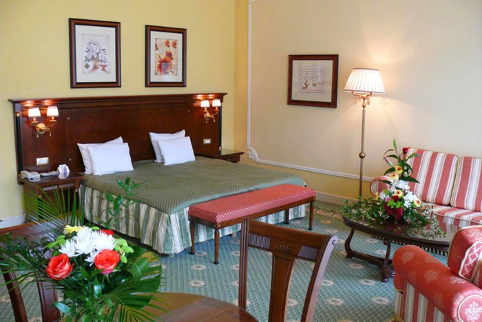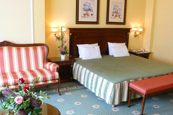 Business Room План (41 кв.м) - большой двухместный номер в историческом здании, кровать 200 x 200 см (king size), банкетка у кровати, рабочий уголок с письменным столом, компьютером и факсом, подключение к высокоскоростному Интернету включено в стоимость номера, лепные украшения, ванная комната с ванной и отдельным туалетом и биде, балкон, вид на парк и курортную зону.