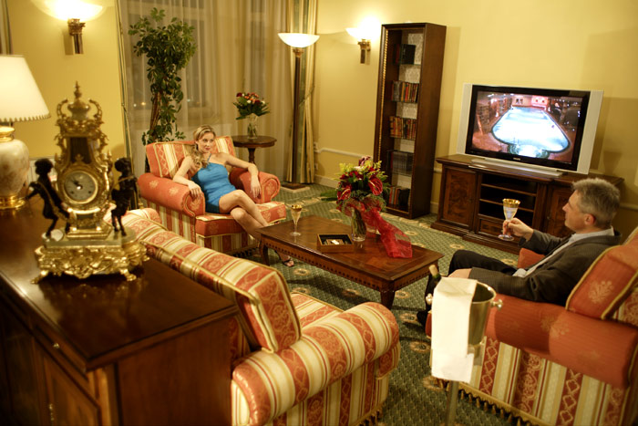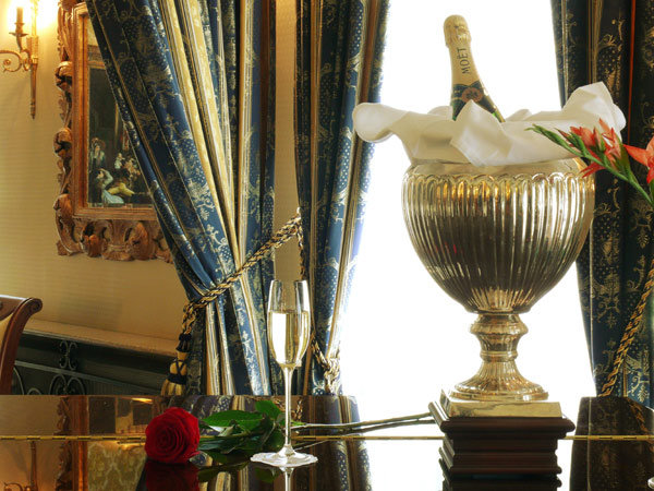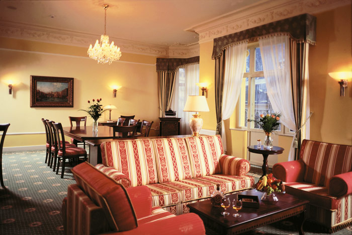 Presidential Suite План (216 кв.м) – самые большие и фешенебельные апартаменты в Карловых Варах (Moser Crystal Suite, соединенный с двухместным номером Supreme). Балкон, кровать в Moser Crystal Suite 220 (ширина) x 200 см, кровать в номере Supreme 200 x 200 см, банкетка у кровати, комната для горничной или личного телохранителя с одной кроватью и собственной ванной комнатой с душем и туалетом, одна гостиная с обеденным столом, кухонный уголок, 1 ванная комната с собственной сауной, джакузи, душем, телевизором, отдельным туалетом и биде, 1 ванная комната с ванной и отдельным туалетом и биде, отдельный туалет для гостей, гардеробная комната, возможность размещения дополнительной кровати, лепные украшения, вид на парк и курортную зону.