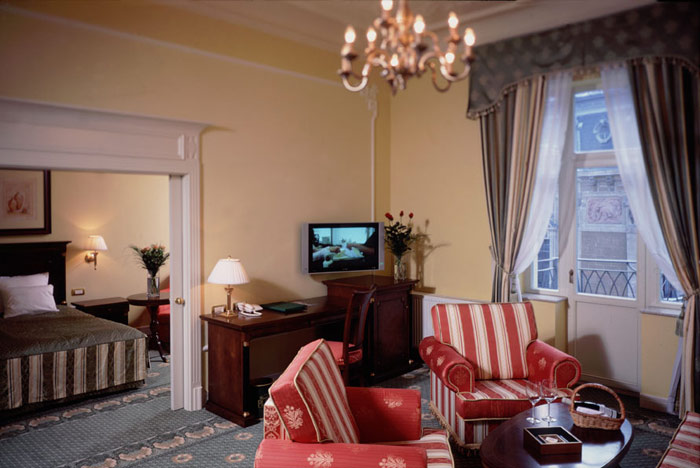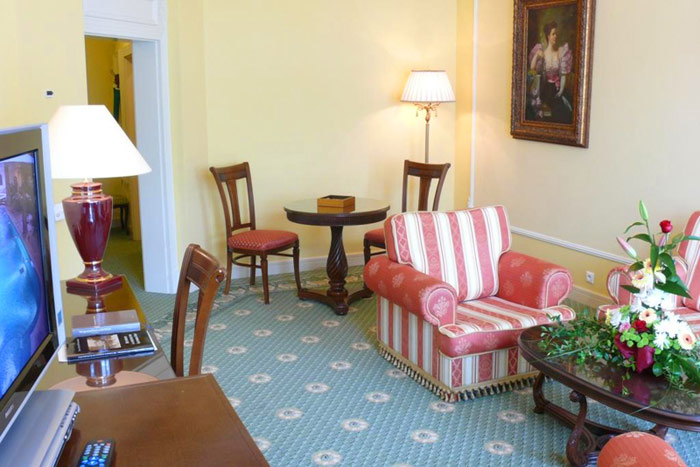 Carlsbad Suite План (64 кв.м) – двухкомнатные апартаменты с одной гостиной и одной спальней, кровать 200 x 200 см (king size), банкетка у кровати, лепные украшения, ванная комната с ванной с отдельным туалетом и биде, возможность размещения дополнительной кровати, вид на "Императорскую Лечебницу". Возможность соединения с двухместным номером Excellent Front View = Premier Suite (106 кв.м).