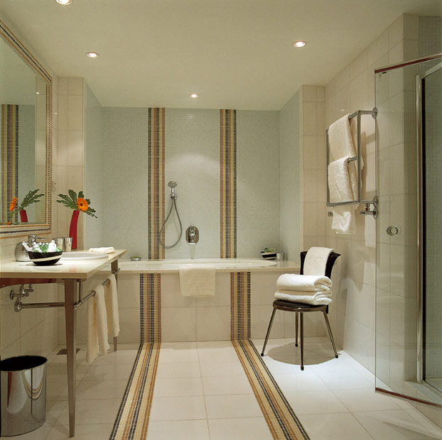 ванная комната с ванной и душем отделана мозаикой, мрамором