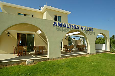 Amalthia Villas - комплекс из 14 вилл в тихой деревенской местности, где разрешено строительство только вилл. Виллы удалены друг от друга и разделены прекрасными садами. Каждая из них построена на земельном участке площадью от 2500 до 4000 кв.м. Участки засажены экзотическими фруктовыми деревьями, роскошными цветами и ярко-зелеными газонами, что придает им неповторимую райскую прелесть. Около каждой виллы имеется зона для барбекю, а также место для парковки. Каждая вилла имеет свой бассейн 4.5 х 13 или 5x15 метров, оснащенный удобными лежаками и зонтами от солнца. Все бассейны облицованы высококачественной немецкой плиткой.На расстоянии 1 км от вилл начинается территория национального заповедника Акамас с удивительными видами и дикими пляжами. Рядом с виллами находится уютный дикий пляж (400 м), 15 минут пешей прогулки. В одном километре от вилл – зоопарк.