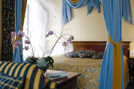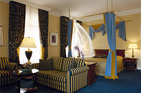Corner Junior Suite (60 кв м): номера выдержаны в мягких тонах – сине-голубом и солнечно-желтом. В спальне: кровать king-size с балдахином. Возможно совмещение с номерами категории Junior Suite.
